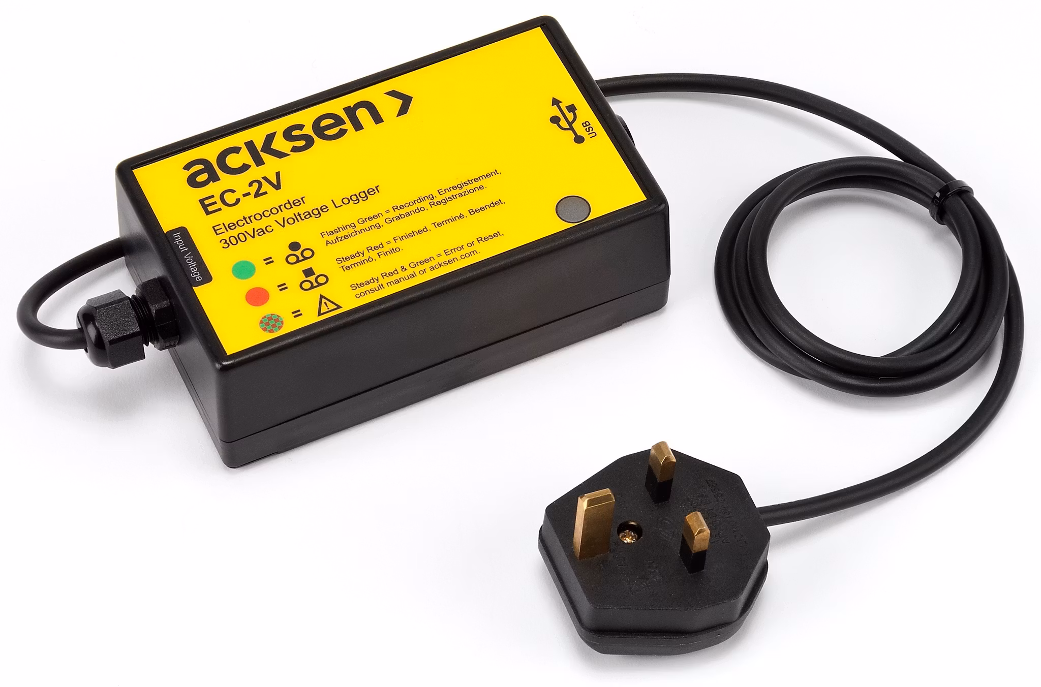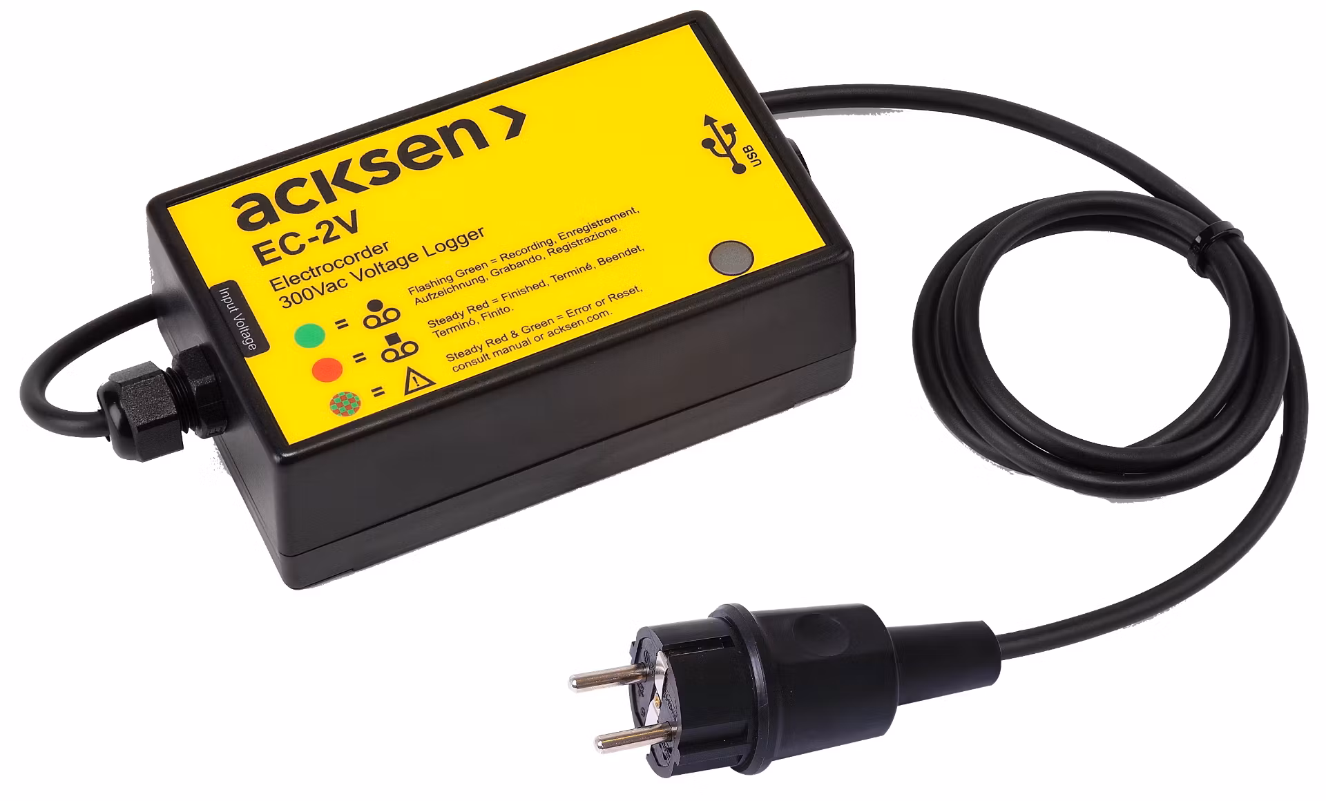 EC-2V er en tokanals spenningsdatalogger som kobles til stikkontakten der du vil måle spenning. Loggeren settes opp i forkant med Electrosoft-programvaren.
